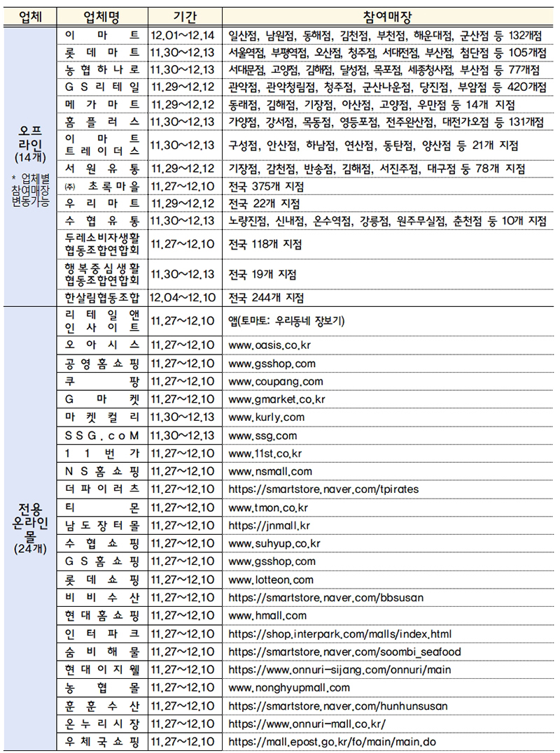3사 대형마트 및 14개 마트(1,766개 점포)와 24개 업체가 있으며 거지 주 가까운 오프라인 마트에 확인하시고 구입하셨으면 합니다. 온라인으로 간편하게 주문할 수 있으니 여기를 참고해주세요