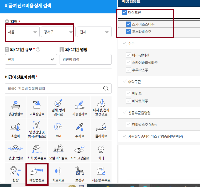 ✅ 홈페이지 접속해서 각각 빨간 박스로 표시된 부분을 맞추고 아래 빨간 표시된 예방 접정로를 클릭합니다.