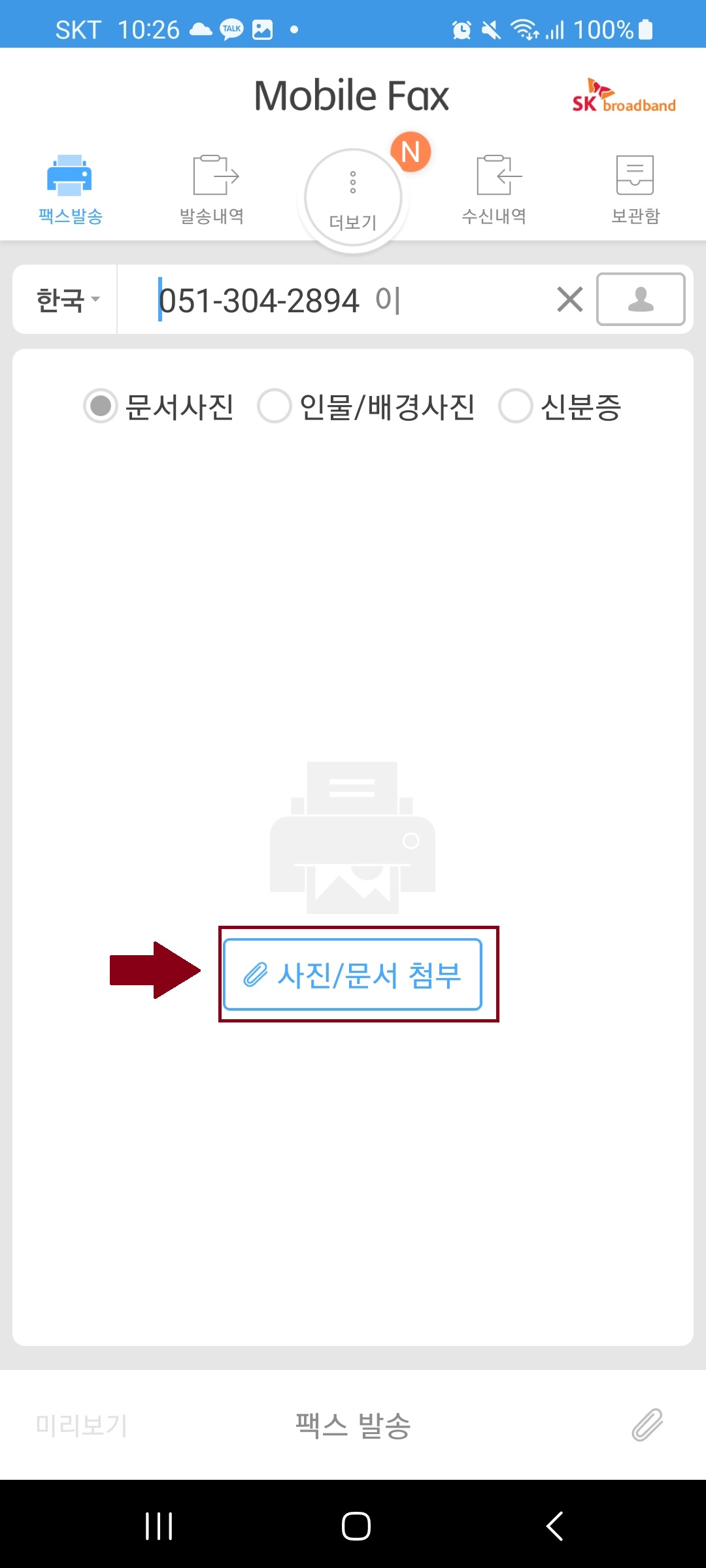 그후 확인을 누르고 팩스 보내기를 원하시는 문서를 보내기 위해서는 빨간 박스 안에 있는 사진/문서를 클릭합니다.