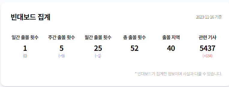아래 페이지 보드를 보시면 상세한 집계 내용이 나오기 있는데요. 지금까지 이런 횟수로 집계 되었습니다. 각각 요소벌료도 출몰횟수가 집계 되었는데요. 일간 출몰 횟수나. 일간 출몰 횟수, 주간 출몰 회수, 월간 출몰 횟수 그리고 관련 기사등 계속 해서 이런 부분이 업데이트 되어서 자료를 제공 하고 있는데요. 지금도 이글 볼때도 숫자가 바뀌어고 있겠죠. 자시한 상화을 알고 싶으시면 아래 버튼을 클릭 하셔서 자료를 확인 해보세요