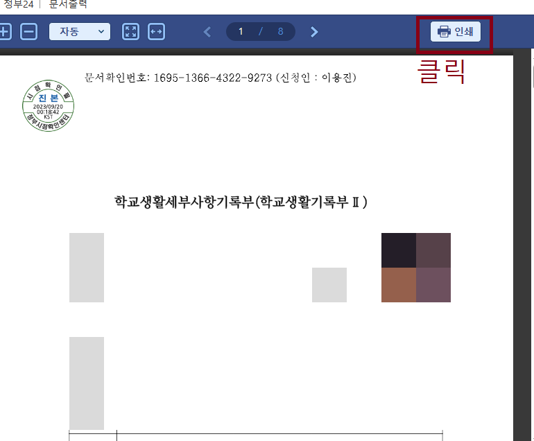 이 페이지로 넘어오면 문서 출력 버튼을 클릭합니다.