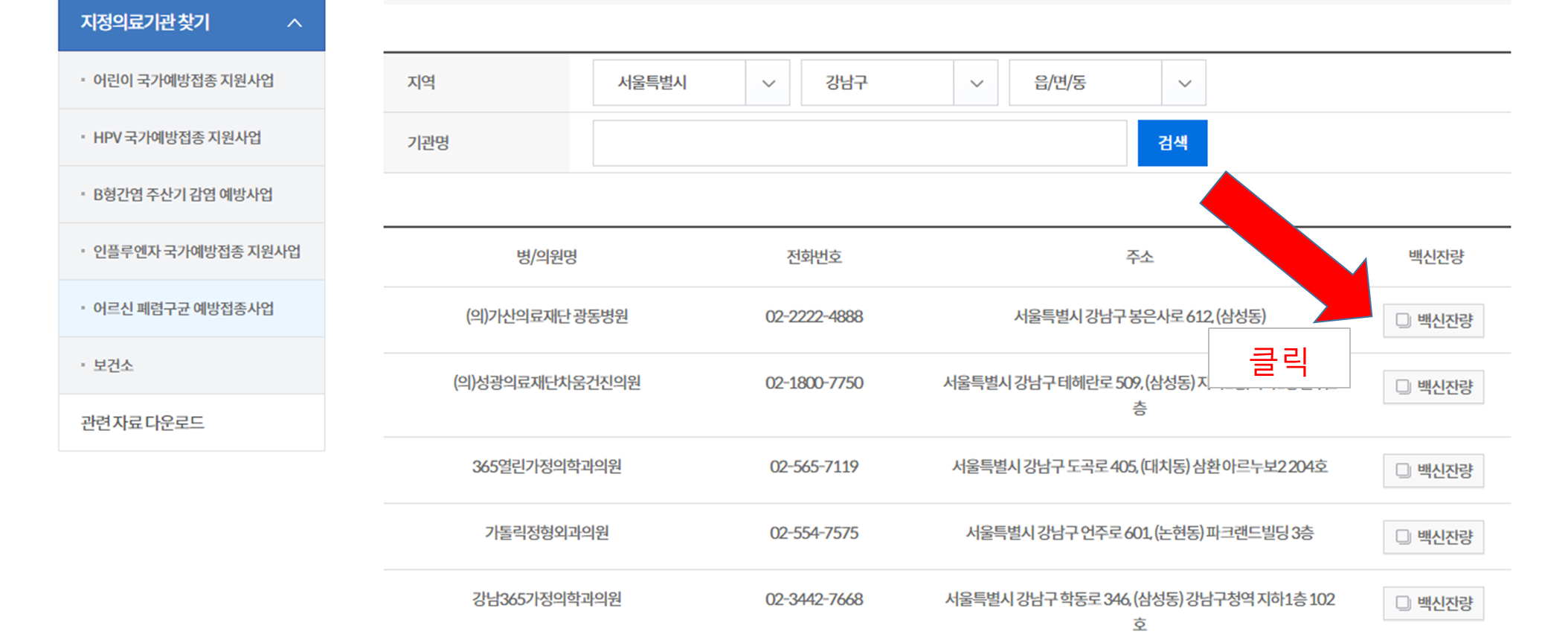 홈페이지 접속해서 지정의료기관 찾기 클릭후 어르신폐렴구균 예방접종 사업을 누른 후 거주지 부분을 검색합니다.